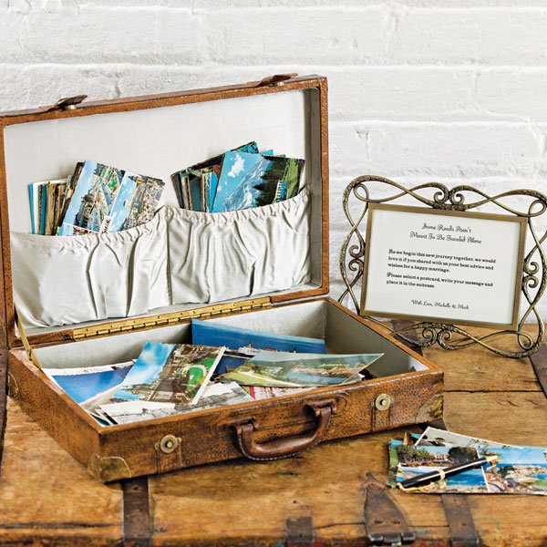 For travel buffs and lovers of vintage, create this luggage “guest book” using a faux vintage suitcase, vintage postcards, a pen and a simple sign to direct your guests. See more DIY ideas!