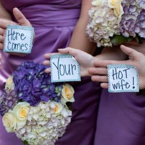 2. Get your bridal party in on the fun. Although I adore all things mush, we all know I can’t deny my inner sass, which is why I just may have my girls flash my groom a message right before I walk down the aisle. Not only is it adorable, but he’ll never expect it...